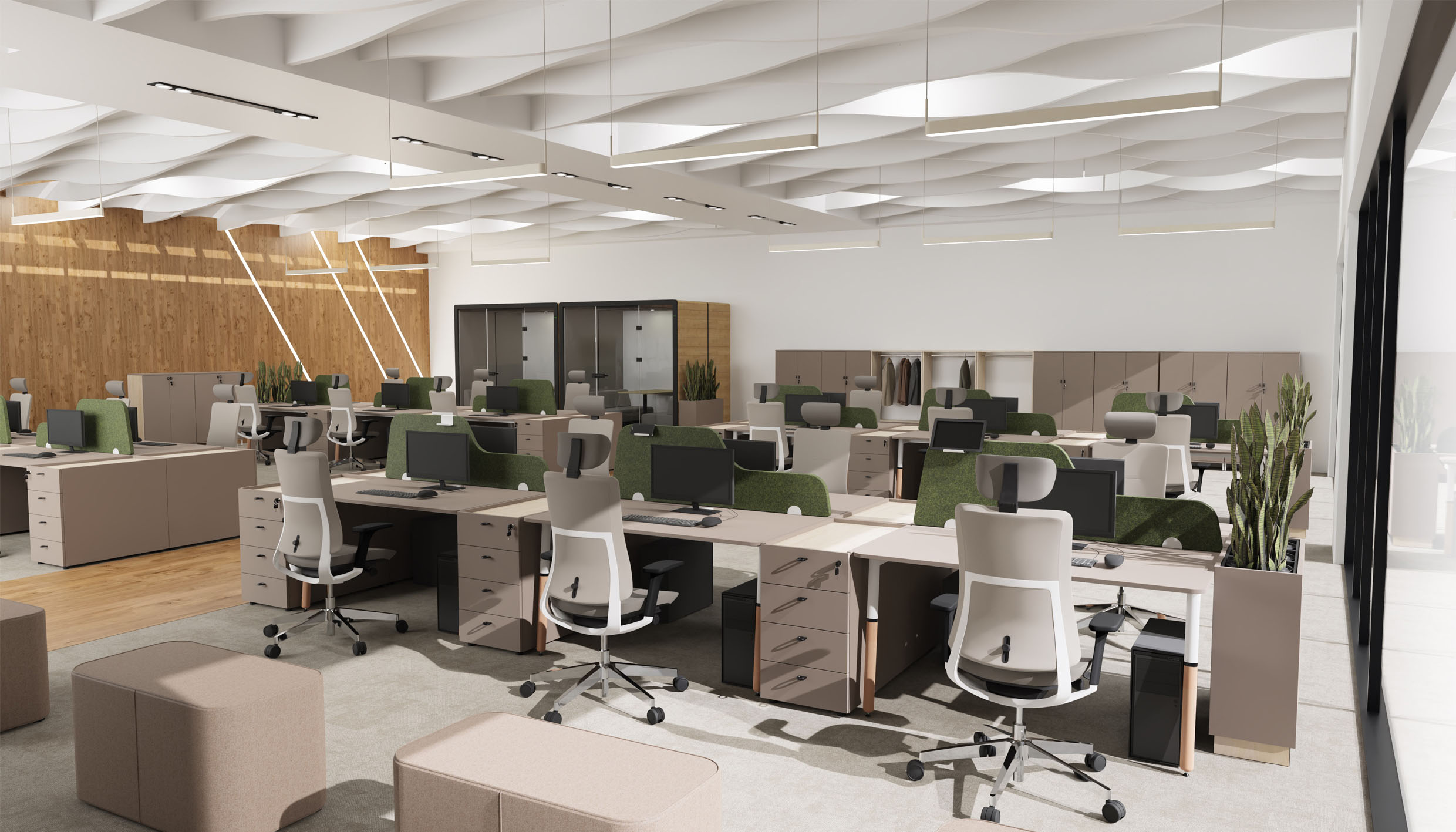 System Puff to kolekcja mebli biurowych, która łączy funkcjonalność z przytulnym, domowym charakterem. Stonowane kolory ziemi oraz miękkie linie sprawiają, że meble te wprowadzą ciepłą, komfortową atmosferę zarówno do biura, jak i przestrzeni domowych.